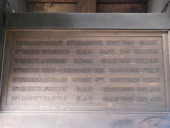 LYCHGATE-LCpl John Leonard Caton Border 6 Sept. 1915 France, C.S.M. Thomas Wood Border 4 Sept. 1916 France, Pte Stanley Steel R.Fus. 14 Oct. 1916 France, Pte Thomas Bell W.C.Yeo 26 Apl. 1917 France, 2Lt. Percy Langhorn Thompson D.L.I. 12 June 1917 Belgium, Rflm Arthur Hill L.Lpls 31 July 1917 France, Pte Gilbert Steel Clarke WC.Yeo 28 Oct. 1917 Belgium, Pte J.W. Bedwell Slater W.Yorks 26 Dec 1917 / Pte Robert Watson E.Yorks 27 May 1918 France, Pte Thomas Taylor M.M. Notts&Derby 8 Oct. 1918 Belgium, Spr George Bowman R.E. 18 Oct 1918 Salonica, Pte William Geo. Barnfather Border. 4 Nov. 1918 France, Pte James Park R.G.A. 12 Nov 1918 France, Stf Nurse Margaret E. Duckers Q.A.I.M.N.S.R. 16 May 1918 Salonica / Lt JDJ. Mein-Austin 3rd Carabiniers. 13 Oct 1944 Burma, Sgt Robert WB. Brown R.A.F. 6 April 1942 Belgium, Dvr Joseph J. Dickson R.A.S.C. 14 May 1945 England, Pte Arthur Dixon London Scottish 19 Nov. 1943 Italy, Lt William A. Goddard Border Regt. 16 Oct. 1944 Italy, Cpl James H. Johnson R.A.F. 20 Aug. 1942 England, P/O Harvey S. Little R.A.F. 31 May 1942 England / Stk 1st Class Reginald Lomas R.N. 25 Feb. 1941 North Sea, Pte Leonard Lomas Loyal Regt (North Lancs) 16 Feb. 1944 Italy, Maj Arthur P.T. Mason R.A. 28 Nov. 1945 England, Flt Sgt Thomas Roper R.A.F. 1 April 1942 Belgium, Gnr John Walton R.A. 5 May 1944 Burma, Plt Sgt Norman Warwick R.A.F. 11 Sep. 1944 Germany, Tpr Wallace Dodd 4th Royal Tank Regt. 20 June 1942 N. Africa / Cpl. Sarah L. Bryant (Nee Feely) B.A.I.C. 17 June 2008 AfghanistanROLL OF HONOUR CARD-Keith Alister/William Barnfather/Thomas Bell/George Bowman/Robert Brown/John Caton/Gilbert Clarke/Arthur Dixon/ Joseph Dickson/Wallace Dodd/William Goddard/Arthur Hill/James Johnson/Harvey Little/Leonard Lomas/ Reginald Lomas/Arthur Mason/James Park/Thomas Roper/Stanley Steel/Bedwell Slater/Thomas Taylor/ Percy Thomson [on Lych gate as Thompson]/John Walton/Norman Warwick/Robert Watson/Thomas Wood/ Staff Nurse Margaret Duckers/and Corporal Sarah Bryant who died in Afghanistan in 2008