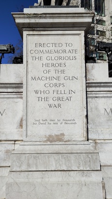 On the front Erected to/commemorate/the glorious/heroes/of the/Machine Gun/Corps/who fell in/the Great/War Saul hath his thousands/but David his tens of thousands MCMXIV MCMXIX ON the back The Machine Gun Corps/of which His Majesty King/George V was Colonel-in/Chief, was formed by Royal/Warrant dated the 14th day/of October 1915. The Corps served in/ France, \Flanders, Russia, Italy/Egypt, Palestine/Mesopotamia/Salonica/India, Afghanistan/and East Africa. The last unit of the Corps/to be disbanded was the/Depot at Shorncliffe pm the/15th day of July 1922. The/total Number who served in/the Corps was some 11,500/Officers and 159,000 other/ranks of whom 1120 Officers/and 12671 other ranks were/ killed and 2881 Officers and 45377 other ranks were/wounded missing or prisoners/of war. Sculptor: Derwent Wood