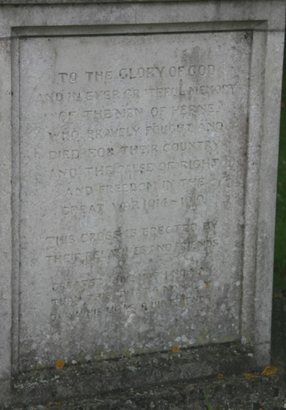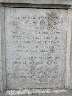 To the glory of God and in ever grateful memory of the men oh Herne who died for their country and the cause of right and freedom in the Great War 1915- 1919. This cross is erected by their relatives and friends. Greater love..etc