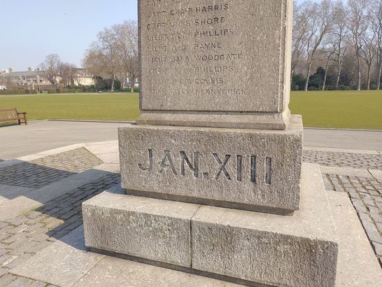 TO THE MEMORY OF/ TWO HUNDRED AND FIFTY-FIVE/ OFFICERS, NON-COMMISSIONED OFFICERS AND PRIVATES/ OF THE XXIV REGIMENT/ WHO FELL AT/ CHILIANWALLA 13 JANUARY 1849/ THIS MONUMENT HAS BEEN ERECTED/ BY THEIR SURVIVING COMRADES/ AD 1853/ (Names)/ 1849 JAN XIII