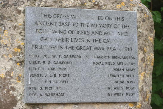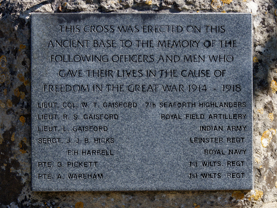 THIS CROSS WAS ERECTED ON THIS/ ANCIENT BASE TO THE MEMORY OF THE/ FOLLOWING OFFICERS AND MEN WHO/ GAVE THEIR LIVES IN THE CAUSE OF/ FREEDOM IN THE GREAT WAR 1914-1918/ (Names)