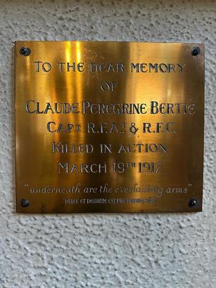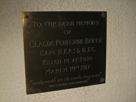 TO THE DEAR MEMORY/OF/CLAUDE PEREGRINE BERTIE//CAPT. R.F.A. & R.F.C./KILLED IN ACTION/MARCH 19TH 1917/"underneath are the everlasting arms"/"DULCE ET DECORUM EST PRO PATRIA MORI"