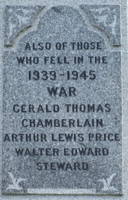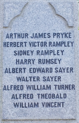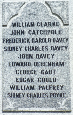(WW1: south face) WILLIAM CLARKE / JOHN CATCHPOLE / FREDERICK HAROLD DAVEY / SIDNEY CHARLES DAVEY / JOHN DAVEY / EDWARD DEBENHAM / GEORGE GAUT / EDGAR GOULD / WILLIAM PALFREY / SIDNEY CHARLES PRYKE / (WW1: north face) ARTHUR JAMES PRYKE. HERBERT VICTOR RAMPLEY. SIDNEY RAMPLEY. HARRY RUMSEY. ALBERT EDWARD SAYER. WALTER SAYER. ALFRED WILLIAM TURNER. ALFRED THEOBALD. WILLIAM VINCENT. (WW2: west face) GERALD THOMAS CHAMBERLAIN. ARTHUR LEWIS PRICE. WALTER EDWARD STEWARD.