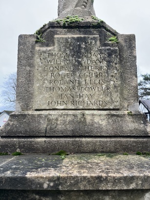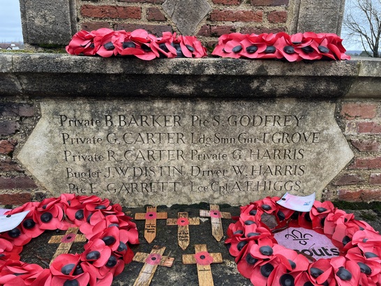 First World War: B Barker, G Carter, R Carter, J W Distin, E Garrett, S Godfrey, T Grove, J Harding, G Harris, W Harris, A Higgs, G Higgs, R Higgs, G H Hobson, W Howard, Harry Hunt, E Lake, B Lawrence, A Luker, Victor Page, R Piercy, W Piercy, C Piercy, C Peddler, C Price, J Ranger, R Saker, F Sandalls, F Saxon-Snell, David Sharp, John Silver, R Simmons, H Smith, S Stroud, A Stubbles, S Tomlin, Harry Tuck, J Usher, R Willsher, H Winkworth, C Woodbridge; Second World War: Thomas Adams, Wilfred Adams, Conrad Cherry, Roger Cluer, Roland Ellis, Thomas Fowler, Ian Hay, Arthur Keeling, Ronald Langley, William Maine, Michael Naylor, Branson Richard, John Richards, Ransford Slater, Henry Taft, Anthony Venner