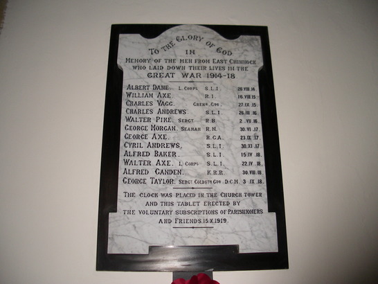 TO THE GLORY OF GOD/ IN /MEMORY OF THE MEN OF EAST CHINNOCK/ WHO LAID DOWN THEIR LIVES IN/ THE GREAT WAR 1914 - 1918/ (NAMES)/ THE CLOCK WAS PLACED IN THE CHURCH TOWER/ AND THIS TABLET ERECTED BY/ THE VOLUNTARY SUBSCRIPTIONS OF PARISHIONERS/ AND FRIENDS 15.X.1919