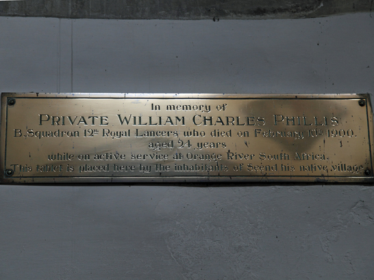 IN MEMORY OF/ PRIVATE WILLIAM CHARLES PHILLIS/ B SQUADRON 12TH ROYAL LANCERS WHO DIED ON FEB 10TH 1900/ AGED 24 YEARS/ WHILST ON ACTIVE SERVICE AT ORANGE RIVER SOUTH AFRICA/ THIS TABLET IS PLACED HERE BY THE INHABITANTS OF SEEND, HIS NATIVE VILLAGE.