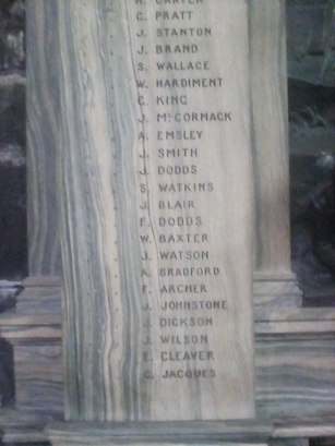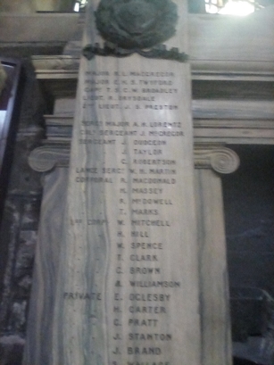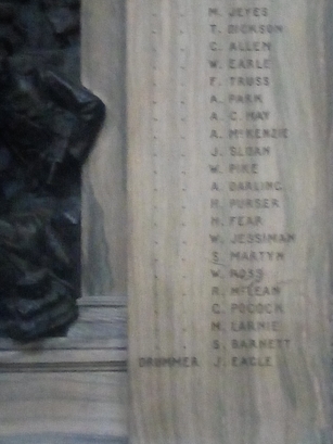 Left side of the memorial ____Major R.L. MacGregar, _ Major E.H.S. Twyford, _ Capt T.S.C.W. Broadley, _ Lieut. R. Drysdale, _ 2nd Lieut J.S. Preston. _ (space) _ Sergt Major A.H. Lorentz, _ Col Sergeant J McGregor, _ Sergeant J. Dudgeon, J. Taylor, C. Robertson, _ Lance Sergt W.H. Martin, _ Corporal R. Macdonald, H. Massey, R. McDowell, T. Marks, _ Lce Corp. W. Mitchell, H. Hill, W. Spence, T. Clark, C. Brown, A. Williamson, Private E. Oglesby, H. Carter, G. Pratt, J. Stanton, J. Brand, S. Wallace, W. Hardiment, G. King, J. McCormack, A. Emsley, J. Smith, J. Dodds, W. Baxter, J. Watson, A. Bradford, F. Archer, J. Johnstone, J. Dickson, J. Wilson, E. Cleaver, C. Jacques. Right side of the memorial ____ Private J. McIver, F. Battison, F. Jones, W. Wilson, D. Lambert, D. Lonie, H. Owen, T. Savage, A. Edwards, J. Andrews, C. Neal, J. Stewart, J. Whiteley, A. Kelly, A. Alvey, J. Murray, J. Simmons, W. Murray, J. Fisher, C. Butler, B. Scrutton, F. Elliott, W. Sheddon, J. Munro, M. Jeyes, T. Dickson, C. Allen, W. Earle, F. Truss, A. Park, A.C. May, A. McKenzie, J. Sloan, W. Pike, A. Darling, H. Purser, H. Fear, W. Jessiman, S. Martyn, W. Ross, R. McLean, C. Pocock, M. Larnie, S. Barnett,_ Drummer J. Eagle.
