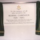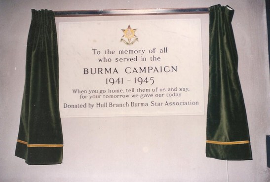 To the memory of all who served in the Burma Campaign 1941-1945/When you go home tell them of us and say/for your tomorrow we gave our today/Donated by Hull Branch Burma Star Association.