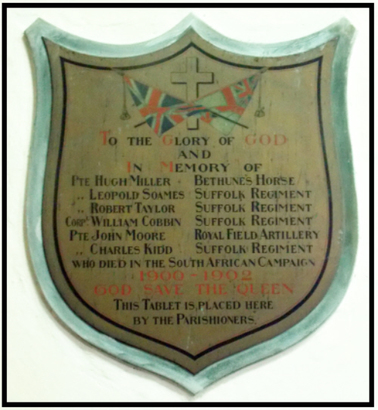 PTE HUGH MILLER - BETHUNE'S HORSE // " LEOPOLD SOAMES - SUFFOLK REGIMENT // " ROBERT TAYLOR - SUFFOLK REGIMENT // CORPL WILLIAM COBBIN - SUFFOLK REGIMENT // PTE JOHN MORRE - ROYAL FIELD ARTILLERY // " CHARLES KIDD -SUFFOLK REGIMENT.