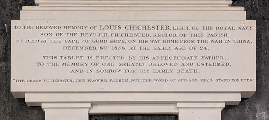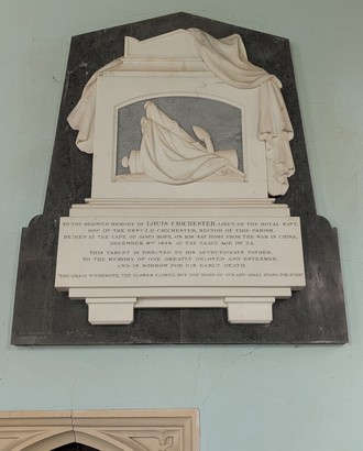 To the beloved memory of Louis Chichester, Lieut. of the Royal Navy / Son of the Revd J H Chichester, Rector of this Parish. / He died at the Cape of Good Hope on his way home from the war in China, / December 8th 1858, at the early age of 24./ This tablet is erected by his affectionate father, /to the memory of one greatly beloved and esteemed,/ and in sorrow for his early death./ 'The grass withereth, the flower fadeth, but the word of our God shall stand for ever'