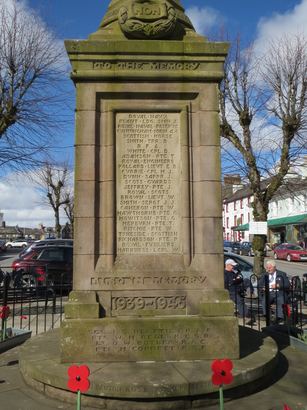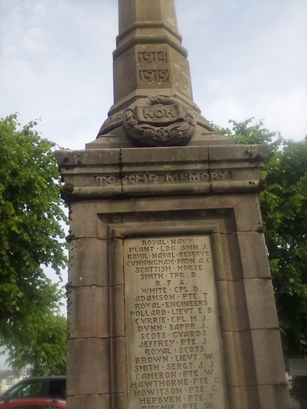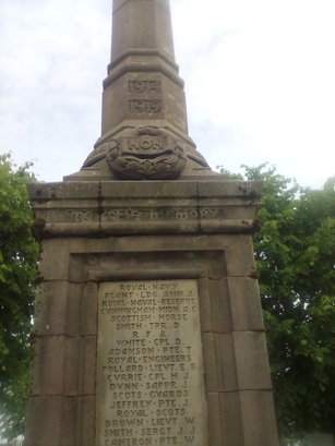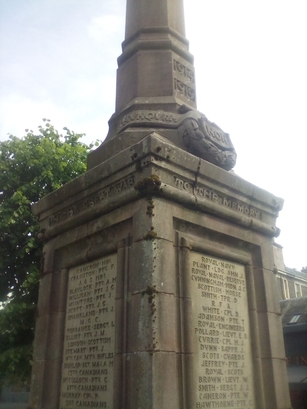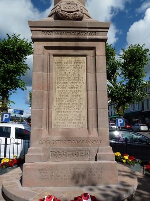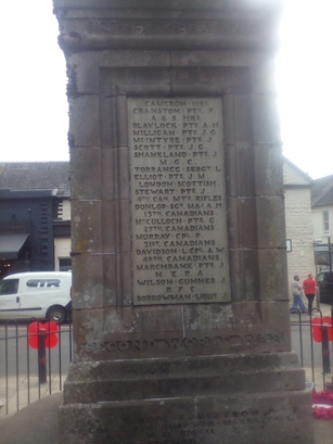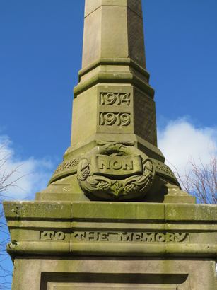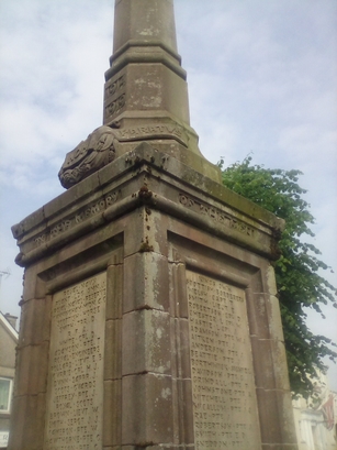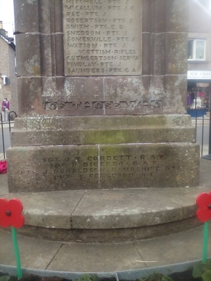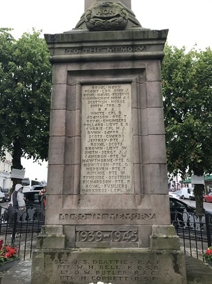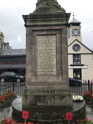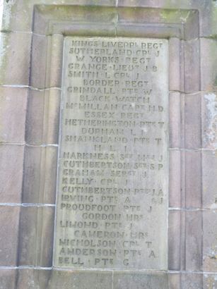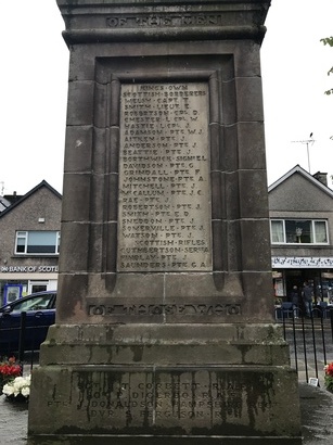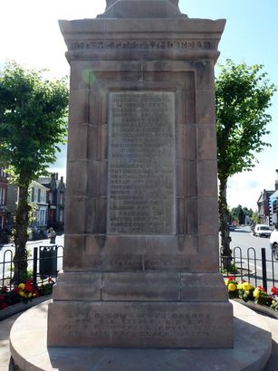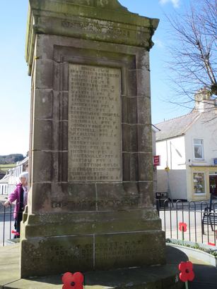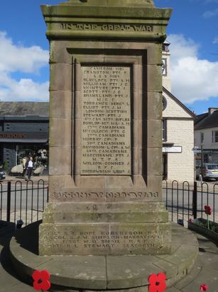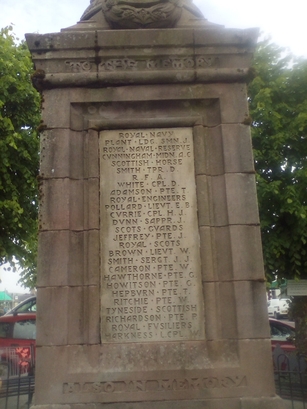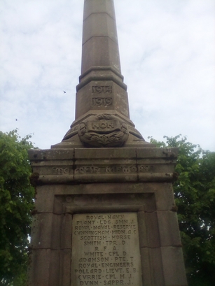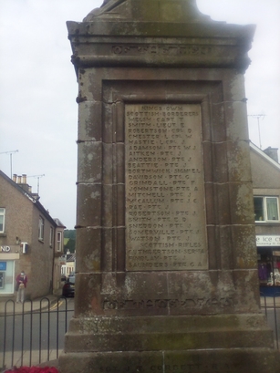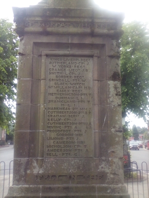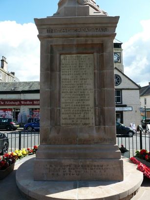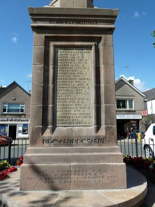 1914-1919 / NVNQVAM NON PARATVS [Never Unprepared] / TO THE MEMORY / OF THE MEN / OF MOFFAT WHO FELL / IN THE GREAT WAR / ALSO IN MEMORY / OF THOSE WHO / FELL IN THE / SECOND WORLD WAR 1939-45