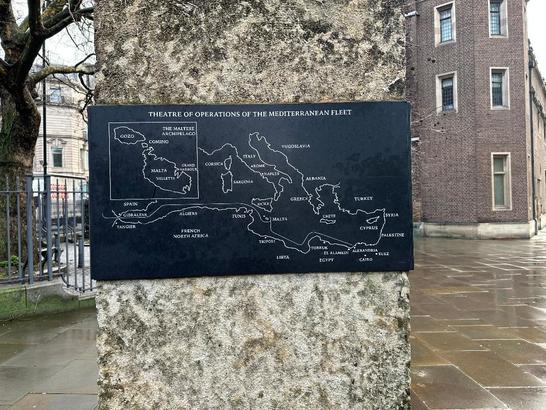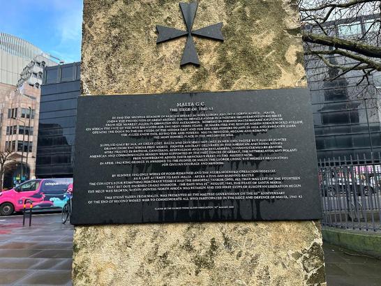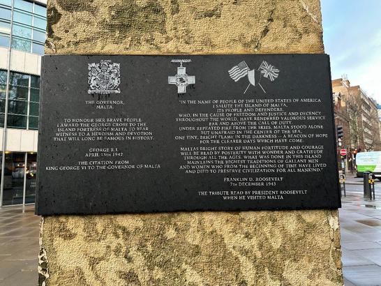 Tablet 1 placed on side of the memorial [existing image is too blurred to read properly]: MALTA G.C./ THE SIEGE OF 1940-43/ IN 1940 ... MALTA, UNDER THE PROTECTION OF GREAT BRITAIN, FOUND HERSELF/ ALONE IN A HOSTILE MEDITERRANEAN 800 MILES FROM HER NEAREST ALLIES IN/ GIBRALTAR AND ALEXANDRIA. BESIEGED BY ENEMIES, .../ MALTA BECAME, AND/ REMAINS, THE MOST BOMBED PLACE IN THE HISTORY OF WAR./ SUPPLIED ONLY BY SEA, AT GREAT COST, MALTA WAS DEFENDED .../ IN APRIL 1942 KING GEORGE VI AWARDED TO THE PEOPLE OF MALTA THE GEORGE/ CROSS .../ IN SUMMER 1942 ONLY WEEKS OF FOOD REMAINED; THE ALLIES MOUNTED OPERATION PEDESTAL, A LAST CHANCE TO SAVE MALTA. .../ TANKER OHIO,/ ... ENTERED GRAND HARBOUR. THE DATE/ WAS AUGUST 15TH. 1942, ... THE SIEGE WAS BROKEN;/ .../ THIS STONE, TAKEN FROM MALTA WAS PRESENTED BY THE MALTESE GOVERNMENT/ ON THE 60TH ANNIVERSARY OF THE END OF SECOND WORLD WAR TO COMMEMORATE ALL WHO PARTICIPATED IN THE SIEGE AND DEFENCE OF MALTA 1940-43./ PLACED BY THE GEORGE CROSS ISLAND ASSOCIATION 15TH AUGUST 2005 Tablet 2-THEATRE OF OPERATIONS OF THE MEDITTERANEAN FLEET/[map below] Tablet 3 Left Hand Side-THE GOVERNOR/MALTA/TO HONOUR HER BRAVE PEOPLE/I AWARD THE GEORGE CROSS TO THE/ISLAND FORTRESS OF MALTA TO BEAR/WITNESS TO A HEROISM AND DEVOTION/THAT WILL LONG BE FAMOUS IN HISTORY/GEORGE R.I./APRIL 15TH 1942/THE CITATION FROM/KING GEORGE TO THE GOVERNOR OF MALTA Tablet 3 Right Hand Side- [representations of the George Cross and the entwined flags of the UK and the USA]/'IN THE NAME OF PEOPLE OF THE UNITED STATES OF AMERICA/I SALUTE THE ISLAND OF MALTA/ITS PEOPLE AND DEFENDERS/WHO, IN THE CAUSE OF FREEDOM AND JUSTICE AND DECENCY/THROUGHOUT THE WORLD HAVE RENDERED VALOROUS SERVICE/FAR AND ABOVE THE CALL OF DUTY/UNDER REPEATED FIRE FROM THE SKIES, MALTA STOOD ALONE/BUT UNAFRAID IN THE CENTER OF THE SEA./ONE TINY, BRIGHT FLAME IN THE DARKNESS... A BEACON OF HOPE/FOR THE CLEARER DAYS WHICH HAVE COME/MALTAS BRIGHT STORY OF HUMAN FORTITUDE AND COURAGE/WILL BE READ BY POSTERITY WITH WONDER AND GRATITUDE/THROUGH ALL THE AGES. WHAT WAS DONE IN THIS ISLAND/MAINTAINS THE HIGHEST TRADITIONS OF GALLANT MEN/AND WOMEN WHO FROM THE BEGINNING OF TIME HAVE LIVED/AND DIED TO PRESERVE CIVILIZATION FOR ALL MANKIND'//FRANKLIN D ROOSEVELT/7TH DECEMBER 1943//THE TRIBUTE READ BY PRESIDENT ROOSEVELT/WHEN HE VISITED MALTA Panel 4- [existing image is too blurred to read]