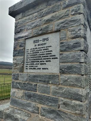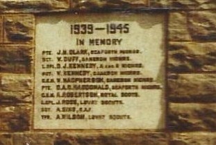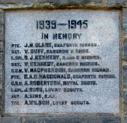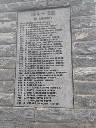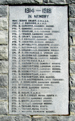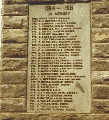 WW1- Miss Jessie Grant, Q.M.A.A.C./ Capt. A.J. Burgess, R.A.O.C./ Pte. D. Cameron, Cameron Highrs./ Pte. T. Cumming, Gordon Highrs./ Pte. D. Douglas M.M. Cameron Highrs./ Pte. J. Fraser, Cameron Highrs./ Pte. D. Grant, Canadian Inf./ Pte. G.E. Hossack, Cameron Highrs./ Pte. Jackson, Gordon Highrs./ Pte. G. McCulloch, Seaforth Highrs./ Sgt. P. MacDonald, Cameron Highrs./ Cpl. A. MacDonald, Cameron Highrs./ Cpl. P.C. MacDonald, S. African Eng./ Pte. A. MacDoanld, Cameron Highrs./ Pte. J. MacDoanld, Cameron Highrs./ Pte. J. MacDoanld, R.A.F./ Sgt. D. Mackintosh, Cameron Highrs./ Pte. A. Mackintosh, Cameron Highrs./ Pte. W. Mackintosh, Cameron Highrs./ Pte. P. Mackintosh, Cameron Highrs./ Pte. A. Mackintosh, R.S.F./ WO. D. Mackintosh, Mer. Marine./ Pte. J.D.S. MacPherson, Royal Fusiliers/ Lieut. J. Morrison, Cameron Highrs./ Pte. W. Munro, Cameron Highrs./ Pte. H. Oree, Cameron highrs./ Pte. G. Ralph, R.S.F./ Pte. D. Ralph, R.A.M.C./ Pte. J.S.T. Ramsay, Royal Scots F./ Pte. H. Smith, Cameron Highrs./ Pte. D. Smith, Cameron Highrs./ Pte. A. Taylor, Cameron Highrs./ Pte. J. Taylor, Royal Scots/ Pte. F. Taylor, Royal Scots/ Pte. J. Walker, Cameron Highrs./ WW2- Pte. J.M. Clark, Seaforth Highrs./ Sgt. W. Duff, Cameron Highrs./ L.Cpl. D.J. Kennedy, A. and S. Highrs/. Sgt. W. Kennedy, Cameron Highrs./ CSM. W. MacPherson, Cameron Highrs/. Pte. D.A.G. MacDonald, Seaforth Highrs/. CSM. A. Robertson, Royal Scots/ L.Cpl. J. Ross, Lovat Scouts/ Sgt. A. Sims, R.A.F./ Tpr. A. Wilson, Lovat Scouts