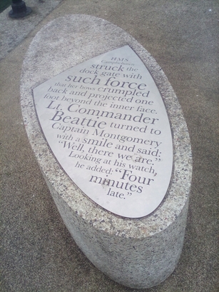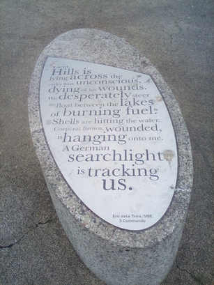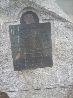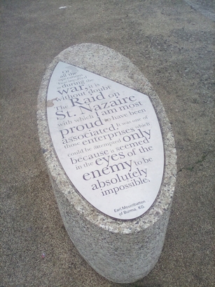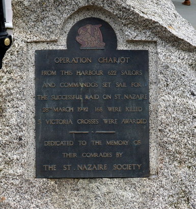 1. OPERATION CHARIOT FROM THIS HARBOUR 622 SAILORS AND COMMANDOS SET SAIL FOR THE SUCCESSFUL RAID ON ST. NAZAIRE 28TH MARCH 1942. 168 WERE KILLED. 5 VICTORIA CROSSES WERE AWARDED. _____ DEDICATED TO THE MEMORY OF THEIR COMRADES BY THE ST. NAZAIRE SOCIETY. 2. All the demolitions at the Forme Ecluse had been completed. These targets included the two caissons, winding houses and machinery, inner caisson and the pump house; all had been destroyed. I requested permission to look for Bill Pritchard rather than embarking and was told by the Adjutant to look at the river. That was my first inkling that anything had gone wrong with our plan. Lt. Col. Bob Montgomery. MC. 3. HMS Cambletown struck the dock gate with such force that her bows crumpled back and projected one foot beyond the inner face. Lt. Commander Beattie turned to Captain Montgomery and with a smile said: 'Well, there we are.' Looking at his watch he added: 'Four minutes late.' 4. Lieut. Hills is lying across the carley float, unconscious, dying of his wounds. We desperately steer the float between the lakes of burning fuel. Shells are hitting the water. Corporal Brown, wounded, is hanging onto me. A German searchlight is tracking us. Eric dela Torre, MBE, 3 Commando. 5. Of all the operations I was involved in during the war, it is without doubt, The Raid on St. Nazaire with which I am most proud to have been accociated. It was one of those enterprises which could be attempted only because it seemed in the eyes of the enemy to be absolutely impossible. Earl Mountbatten of Burma, KG. 6. Well chaps, we've missed the boat home. We'll have to walk. Lt. Colonel A C Newman, VC. 7. Your sons are the sons of France. Their memory is hallowed. Jean Guitton, Croix de Combattant, OBE. 8. To commemorate the rededication by TRH The Prince of Wales and The Duchess of Cornwall on 11th July 2008.