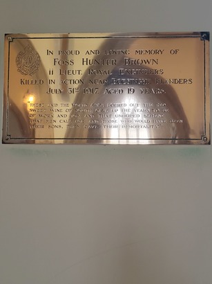 IN PROUD AND LOVING MEMORY OF / FOSS HUNTER BROWN / ii LIEUT. ROYAL ENGINEERS / KILLED IN ACTION NEAR BOESINGHE, FLANDERS / JULY 31ST 1917, AGED 19 YEARS. / 'THESE LAID THE WORLD AWAY: POURED OUT THE RED / SWEET WINE OF YOUTH. GAVE UP THE YEARS TO BE / OF WORK AND JOY. AND THAT UNHOPED SERENE / THAT MEN CALL AGE: AND THOSE WHO WOULD HAVE BEEN / THEIR SONS, THEY GAVE THEIR IMORTALITY.