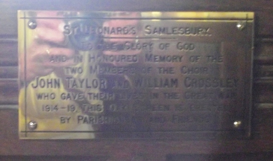 St. Leonard's Samlesbury. To the glory of God and in honoured memory of the two members of the choir John Taylor and William Crossley who gave their lives in the Great War 1914 - 1919. This oak screen is erected by parishioners and friends.