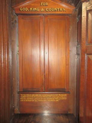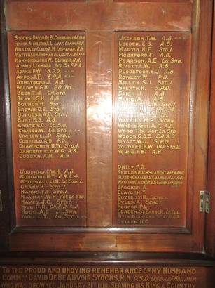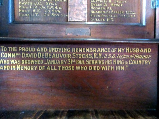 For God, King & CountryGreater Love Hath No Man Than This To the Proud and Undying Remembrance of my Husband Commander David De Beauvoir Stocks RM DSO Legion D'Honour who was drowned 31st January 1918 Serving his King & Country and in Memory of all those who died with him.