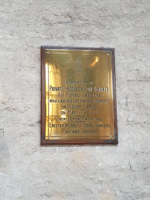In memory of Private Frederick John Barker XII Royal Lancers who gave his life for his country in South Africa on May 12th 1900. 'There is mercy with Thee'. Erected by the XII Royal Lancers past and present.