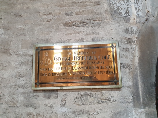In memory of George Frederick Cole (Corporal 19th Hussars). Lost his life in Ladysmith during the siege. Born in this parish 5th August 1874. Died 9th Decbr. 1899. A good soldier of Jesus Christ.