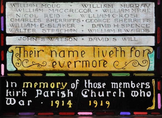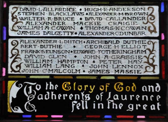 To the Glory of God and in Memory of those Members and Adherents of Laurencekirk Parish Church who fell in the Great War 1914-1919