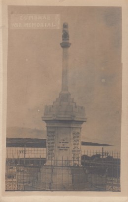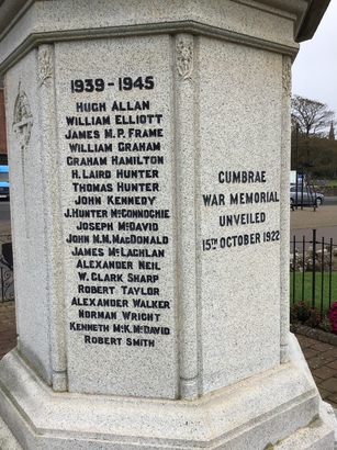CUMBRAEWAR MEMORIAL UNVEILED 15TH. OCTOBER 1922 TO THE MEMORY OF OUR HEROIC DEAD 1914 – 1919 1939 – 1945
