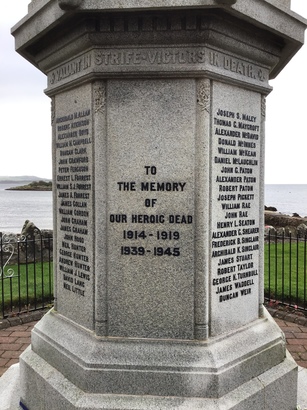 WWI ROLL OF HONOUR: Archibald M. Allan Robert Atkinson Alexander Boyd William M Campbell Duncan Clark John Crawford Peter Ferguson Ernest L. Forrest William S.J. Forrest James A. Forrest James Gollan William Gordon John Graham James Graham John Hood Neil Hunter George Hunter Andrew Hunter William J. Lewis David Lang Neil Little Joseph S. Maley Thomas G. Maycroft Alexander McDavid Donald McInnes William McKean Daniel McLauchlin John G. Paton Alexander Paton Robert Paton Joseph Pickett William Rae John Rae Henry L. Seaton Alexander G. Shearer Frederick B. Sinclair Archibald K.Sinclair James Stuart Robert Taylor George K. Turnbull James Waddell Duncan Weir WWII ROLL OF HONOUR: Hugh Allan William Elliott James M.P Frame. William Graham Graham Hamilton H. Laird Hunter Thomas Hunter John Kennedy J. Hunter McConnochie Joseph McDavid John M.M. MacDonald James McLachlan Alexander Neil W. Clark Sharp Alexander Walker Robert Taylor Norman Wright Kenneth McK. McDavid Robert Smith