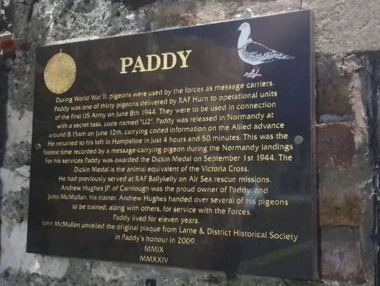 PADDY. HOMING PIGEON RELEASED FROM NORMANDY BEACH 8TH JUNE 1944, CARRYING MESSAGE TO RAF HURN HAMPSHIRE. PADDY AWARDED DICKIN MEDAL, THE EQUIVALENT OF THE VC, THE ONLY IRISH RECIPIENT OF THE AWARD