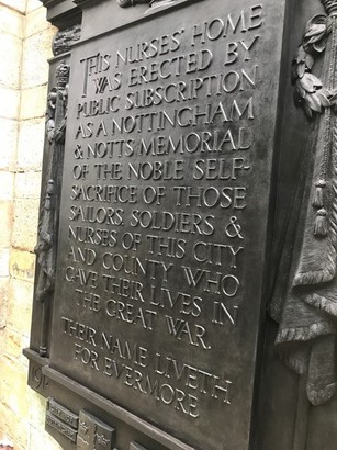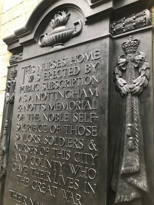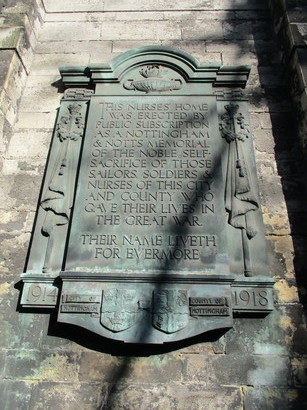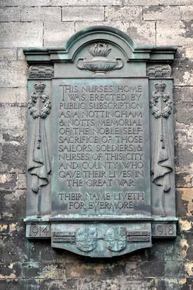 On south wall elevation plaque: "This nurses' home was erected by public subscription as a Nottingham and Notts memorial of the noble self sacrifice of those sailors, soldiers & nurses of this city and county who gave their lives in the great war. Their name liveth for evermore" all in capital letters on plaque Below: 1914, arms of the city and county, 1918