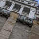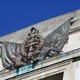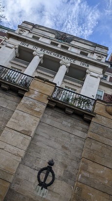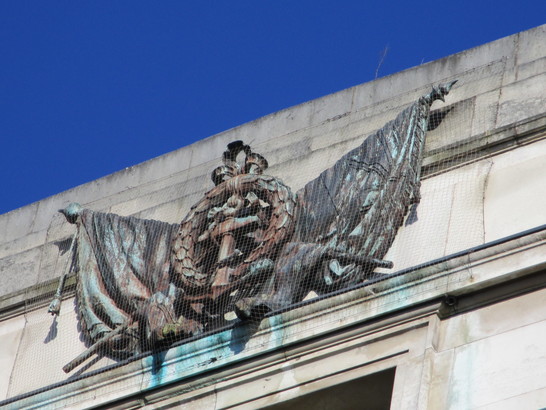 Flag and wreath motif at top of building (thought to be covered with protective mesh which is visible in image) - Taken by The Nottingham Park Estate Conservation Trust 22 Mar 2018