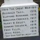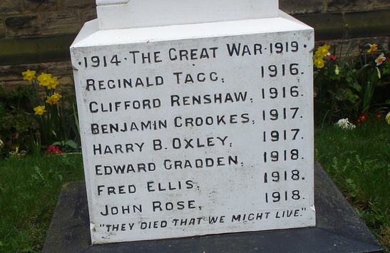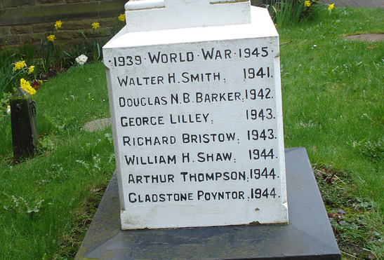 WWI:Reginald Tagg 1916, Clifford Renshaw 1916, Benjamin Crookes 1917, Harry B Oxley 1917, Edward Gradden 1918, Fred Ellis 1918, John Rose 1918.WWII: Walter H Smith 1941, Douglas N B Barker 1942, George Lilley 1943, Richard Bristow 1943, William H Shaw 1944, Arthur Thompson 1944, Gladstone Poyntor 1944.