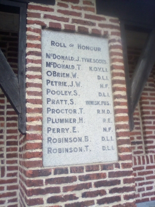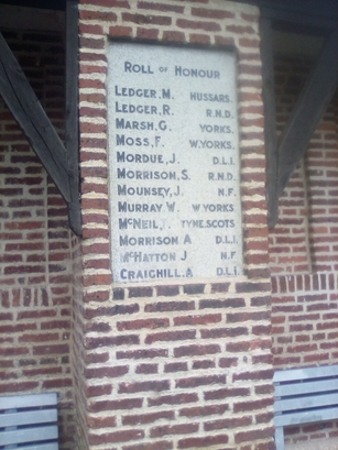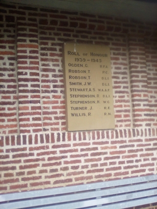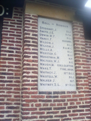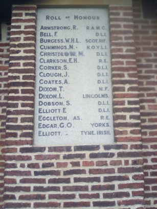 WW1- Tablet 1- ROLL OF HONOUR/ Elliott W RE/ Farbridge R HMS Marlborough/ Graham G KOYLI/ Geddes T W RND/ Graver A Worcesters/ Hobbs R DLI/ Hodgson J DLI/ Heslop M W Yorks/ Hughes J S DLI/ Hall W RND/ Johnson C RFA/ Moffatt A RS; Tablet 2- ROLL OF HONOUR/ Ledger M Hussars/ Ledger R RND/ Marsh G Yorks/ Moss F W Yorks/ Mordue J DLI/ Morrison S RND/ Mounsey J NF/ Murray W W Yorks/ McNeil Tyne Scots/ Morrison A DLI/ McHatton J NF/ Craighill A DLI; Tablet 3-ROLL OF HONOUR/ Armstrong R RAMC/ Bell F DLI/ Burgess WHL Scot Rif/ Cummings N KOYLI/ Christelow M DLI/ Clarkson EH RE/ Corker S DLI/ Clough J DLI/ Coates A DLI/ Dixon T NF/ Dixon L Lincolns/ Dobson S DLI/ Elliott E DLI/ Eggleton A S RE/ Edgar G O Yorks/ Elliott Tyne Irish; Tablet 4- ROLL OF HONOUR/ Stoddart J DLI/ Smith JE RFA/ Urwin W F DLI/ Varey F Hussars/ Wilson J DLI/ Wilson J RAMC/ Wells A DLI/ Webster G DLI/ Weightman M NF/ Walters W J RE/ Waugh M HMS Glatton/ Wake T Tyne Irish/ Whitney J 12th DLI/ Waistell W DLI/ Walker J NF/ Whitney S L 8th DLI; Tablet 5- McDonald J Tyne Scots/ McDonald T KOYLI/ O'Brien W DLI/ Petrie J W NF/ Pooley S DLI/ Pratt S Innisk Fus/ Proctor T RND/ Plummer H RE/ Perry E NF/ Robinson B DLI/ Robinson T DLI; Tablet 6- ROLL OF HONOUR/ Rudd N DLI/ Ridley R DLI/ Rutherford B E Yorks/ Robinson J 8th DLI / Scott N DLI/ Salmon W Leic. Rgt/ Salmon M W Yorks/ Smith E DLI/ Scott J DLI/ Scott W NF/ Sanderson J ASC; 1930 North West Frontier - ROLL OF HONOUR/PTE N SIMMS/NORTH WEST FRONTIER/OF INDIA 1930; WW2- Tablet 1- ROLL OF HONOUR/1939-1945/ Ogden G RFA/ Robson T PC/ Robson T DLI/ Smith J W DLI/ Stewart AS WAAF/ Stephenson R DLI/ Stephenson H WG/ Turner J RE/ Willis R RN; Tablet 2- ROLL OF HONOUR 1939-1945/ Barron L RA/ Barron R RHA/ Bennett J RN/ Cann A RE/ Close L RAF/ Clarkson O RN/ Gilroy W RAFC/ Halpin J GH/ Hilland J RAF/ Jose S RA