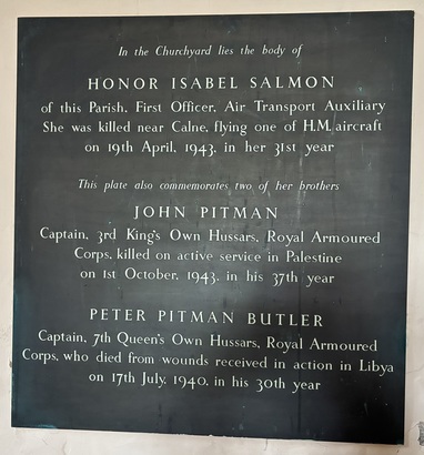 In The Churchyard Lies The Body Of/ Honor Isabel Salmon/ Of This Parish. First Officer, Air Transport Auxiliary./ She Was Killed Near Calne, Flying On Eof Hm Aircraft/ On 19th April 1943 In Her 31st Year/ This Plate Also Commemorates Two Of Her Brothers/ John Pitman/ Captain 3rd Kings Own Hussars. Royal Armoured/ Corps. Killed On Active Service In Palestine/ On 1st October 1943 In His 37th Year/ Peter Pitman Butler/ Captain, 7th Queens Own Hussars, Royal Armoured/ Corps, Who Died From Wounds Received In Action In Libya/ On 17th July 1940, In His 30th Year