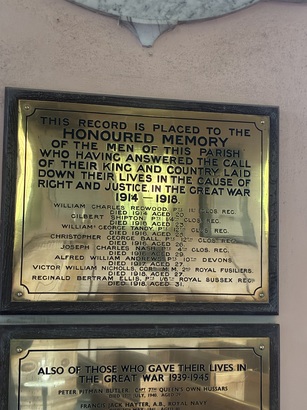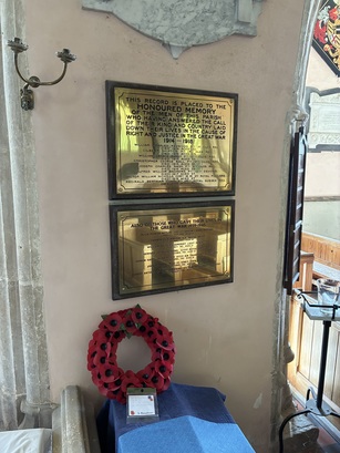 [WWI plaque] This Record Is Placed To The/ Honoured Memory/ Of The Men Of This Parish/ Who Having Answered The Call/ Of Their King And Country Laid/ Down Their Lives In The Cause Of/ Right And Justice, In The Great War/ 1914-1918./ (Names) [WWII plaque] Also Of Those Who Gave Their Lives In/ The Great War 1939-1945/ (Names)