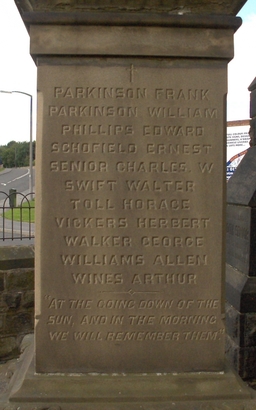 Bates Harold, Bates William, Bennett Clarence, Bonson Harry, Brown William, Buckbury Isaac, Buckley Samuel, Ellis John R, Funnell Richard K, Lloyd Thomas, Morgan George, Parkin Charles, Parkinson Frank, Parkinson William, Phillips Edward, Schofield Ernest, Senior Charles W, Swift Walter, Toll Horace, Vickers Herbert, Walker George, Williams Allen, Wines Arthur,