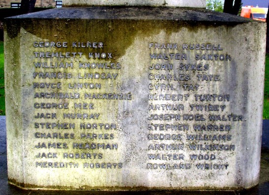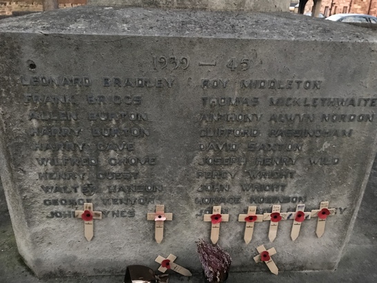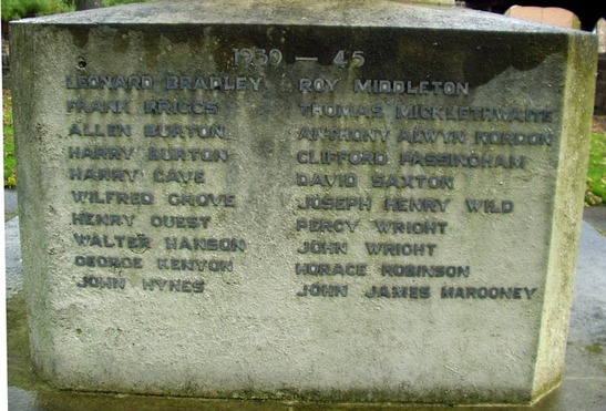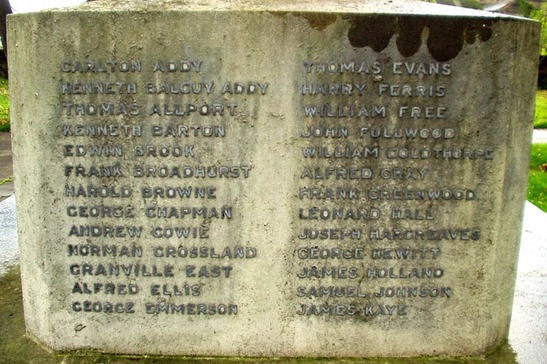Carlton Addy, Kenneth Balguy Addy, Thomas Allport, Kenneth Barton, Edwin Brook, Frank Broadhurst, Harold Browne, George Chapman, Andrew Cowie, Norman Crossland, Granville East, Alfred Ellis, George Emmerson, Thomas Evans, Harry Ferris, William Free, John Fullwood, William Goldthorpe, Alfred Gray, Frank Greenwood, Leonard Hall, Joseph Hargreaves, George Newitt, James Holland, Samuel Johnson, James Kaye, George Kilner, Tremlett Knox, William Knowles, Francis Lindsay, Royce Linton, Archibald Mackenzie, George Mee, Jack Murray, Stephen Norton, Charles Parkes, James Readman, Jack Roberts, Meredith Roberts, Frank Russell, Walter Saxton, John Sykes, Charles Tate, Cyril Tate, Herbert Turton, Arthur Twibey, Joseph Noel Walter, Stephen Warren, George Williams, Arthur Wilkinson, Walter Wood, Rowland Wright, [1939-45] Leonard Bradley, Frank Briggs, Allen Burton, Harry Burton, Harry Cave, Wilfred Grove, Henry Guest, Walter Hanson, George Kenyon, John Hynes, Roy Middleton, Thomas Micklethwaite, Anthony Alwyn Nordon, Clifford Passingham, David Saxton, Joseph Henry Wild, Percy Wright, John Wright, Harace Robinson, John James Marooney.