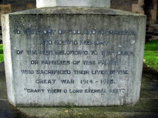 To the glory of God and in grateful and loving memory of the men belonging to the homes or families of this parish who sacrificed their lives in the Great War 1914 - 1918 'Grant them O Lord eternal rest'