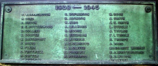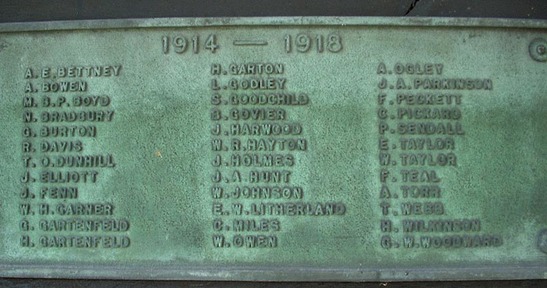 [WW1] A E Bettney, A Bowen, M B P Boyd, N Bradbury, G Burton, R Davis, T O Dunhill, J Elliott, J Fenn, W H Garner, G Gartenfeld, H Gartenfeld, H Garton, L Godley, S Goodchild, S Govier, J Harwood, W R Hayton, J Holmes, J A Hunt, W Johnson, E W Litherland, C Miles, W Owen, A Ogley, J A Parkinson, F Peckett, C Pickard, P Sendall, E Taylor, W Taylor, F Teal, A Torr, T Webb, H Wilkinson, G W Woodward, [WW2] F Barraclough, H Bird, A Brook, R E Butterwood, D Collins, C Cooper, W Davenport, F Davis, W Flynn, C Fretwell, H Goften, H Roberts, H Hopkinson, R Jackson, W King, A Lillward, R Moore, G Needham, J Nichols, A E Oldroyd, T A Oliver, E Pashley, H Richards, M Rose, J Smith, J E Smith, L Steele, J Taylor, F I Tibble, R Thorpe, A Ward, Margaret Wardle, R A Whittlestone, R B Wilson, D Livett,