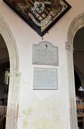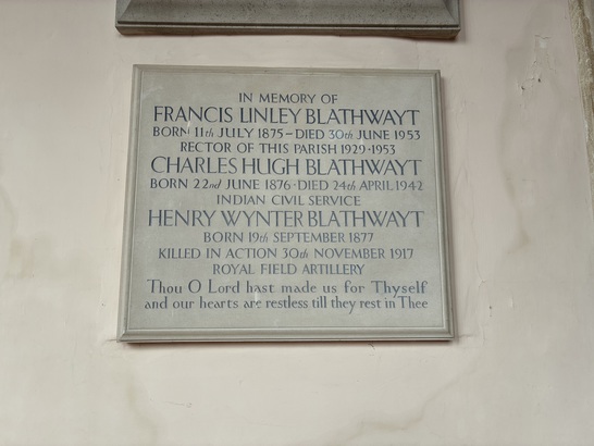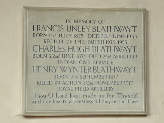 In memory of Francis Linley Blathwayt, born 11th July 1875 - died 30th June 1953, Rector of this parish 1929 - 1953.Charles Hugh Blathwayt, born 22nd June 1876, died 24th April 1942, Indian Civil Service. Henry Wynter Blathwayt, born 19th September 1877, killed in action 39th November 1917, Royal Field Artillery. Thou O Lord hast made us for Thyself and our hearts are restless till they rest in Thee.