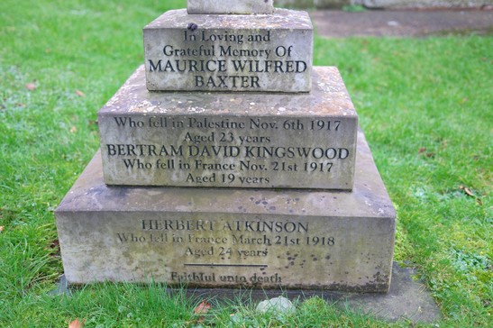 In loving and grateful memory of/ Maurice Wilfred Baxter who fell in Palestine Nov 6th 1917 Aged 23 years. Bertram David Kingswood who fell in France Nov 21st 1917 Aged 19 years.Herbert Atkinson who fell in France March 21st 1918 Aged 24 years./ Faithful unto death. Three Cribbs in WWII.