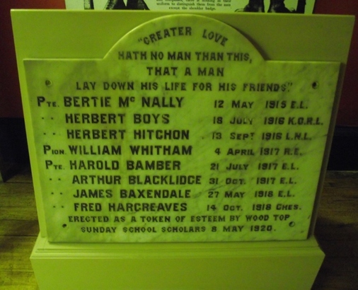 'Greater love hath no man than this, that a man lay down his life for his friends'. Erected as a token of esteem by Wood Top Sunday School scholars. 8 May 1920.