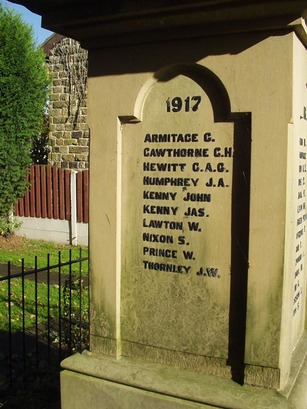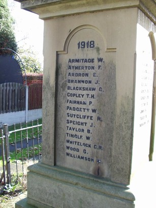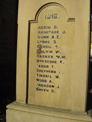 1914Cornish, J, Jepson, J E, 1915 Cullumbine, J, Harrison, W J, Mann, J, Priestley, F, Woodhouse, G, 1916 Askin, D, Armitage, J, Dunn, A E, Lyons, C, Merril, E, Malkin, W, Parker, W W, Roystone, E, Sagar, T, Shepherd, H, Tindall, W, Wood, A, Jackson, J, Smith, S. 1917 Armitage, G, Cawthorne, C H Hewitt, C A G, Humphrey, J A, Kenny, John, Kenny, Jas, Lawton, W, Nixon, S, Prince, W, Thornley, J W, 1918 Armitage, W, Atherton, F, Ardron, E, Brannon, J, Blackshaw, G, Copley, T H, Fairham, P, Padgett, W, Sutcliffe, R, Speight, J, Taylor, B, Tingle, W, Whitelock, G R, Wood, G, Williamson, W,