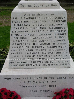 1914/ 1919 / TO THE GLORY OF GOD/ AND IN MEMORY OF/ (Names)/ WHO GAVE THEIR LIVES IN THE GREAT WAR/ THAT WE MIGHT LIVE/ "OBEDIENT UNTO DEATH/ JESU MERCY"