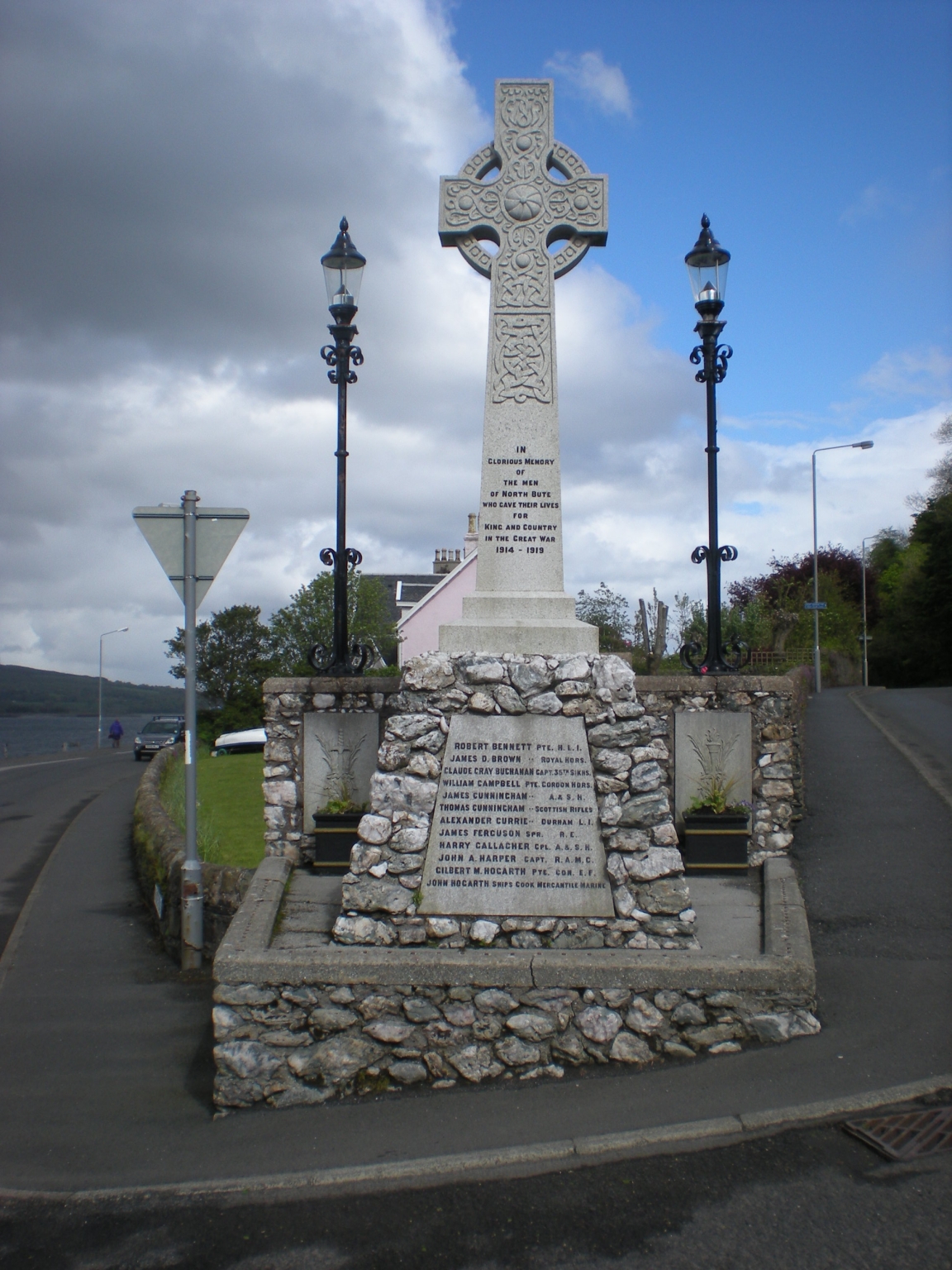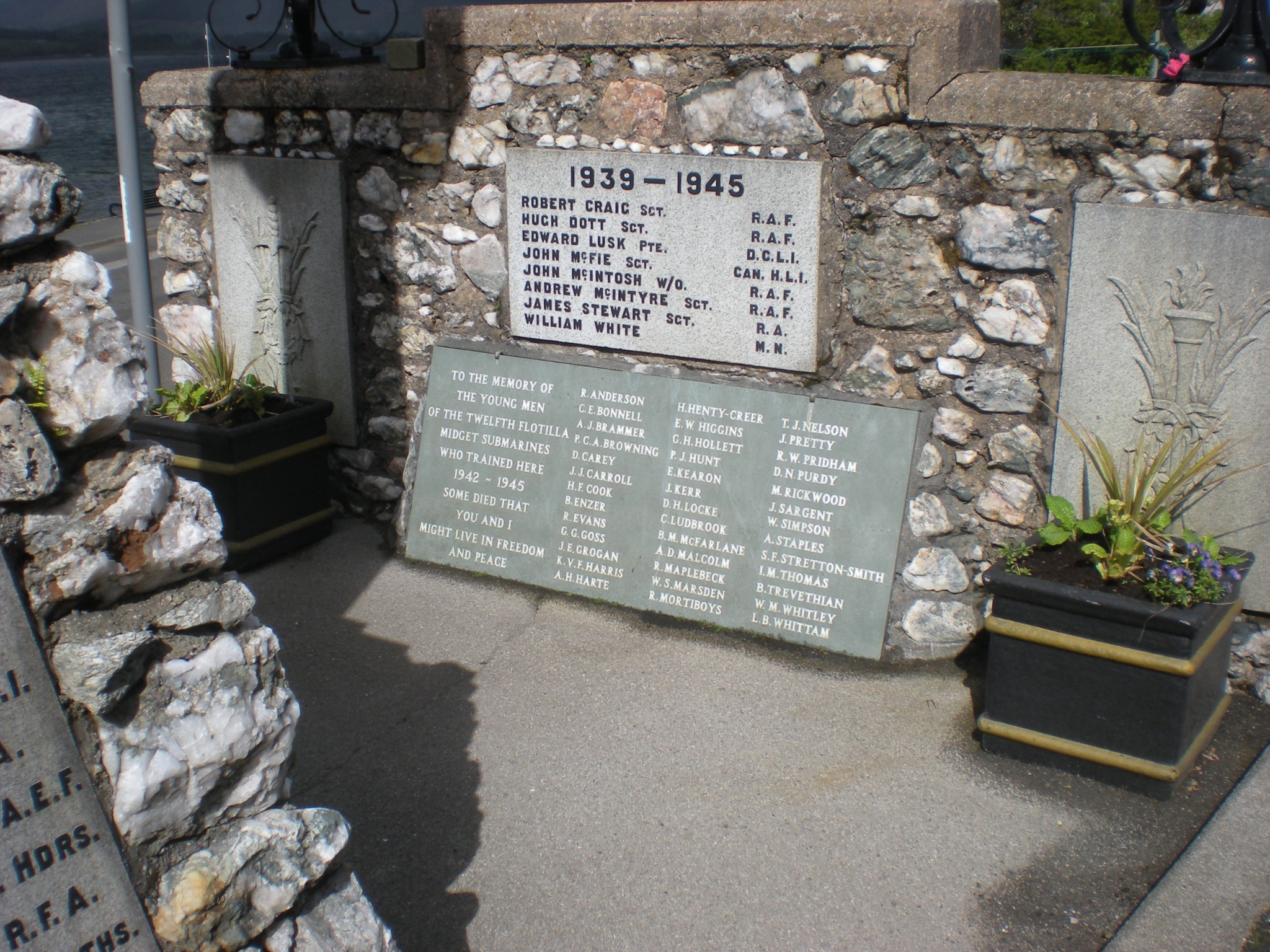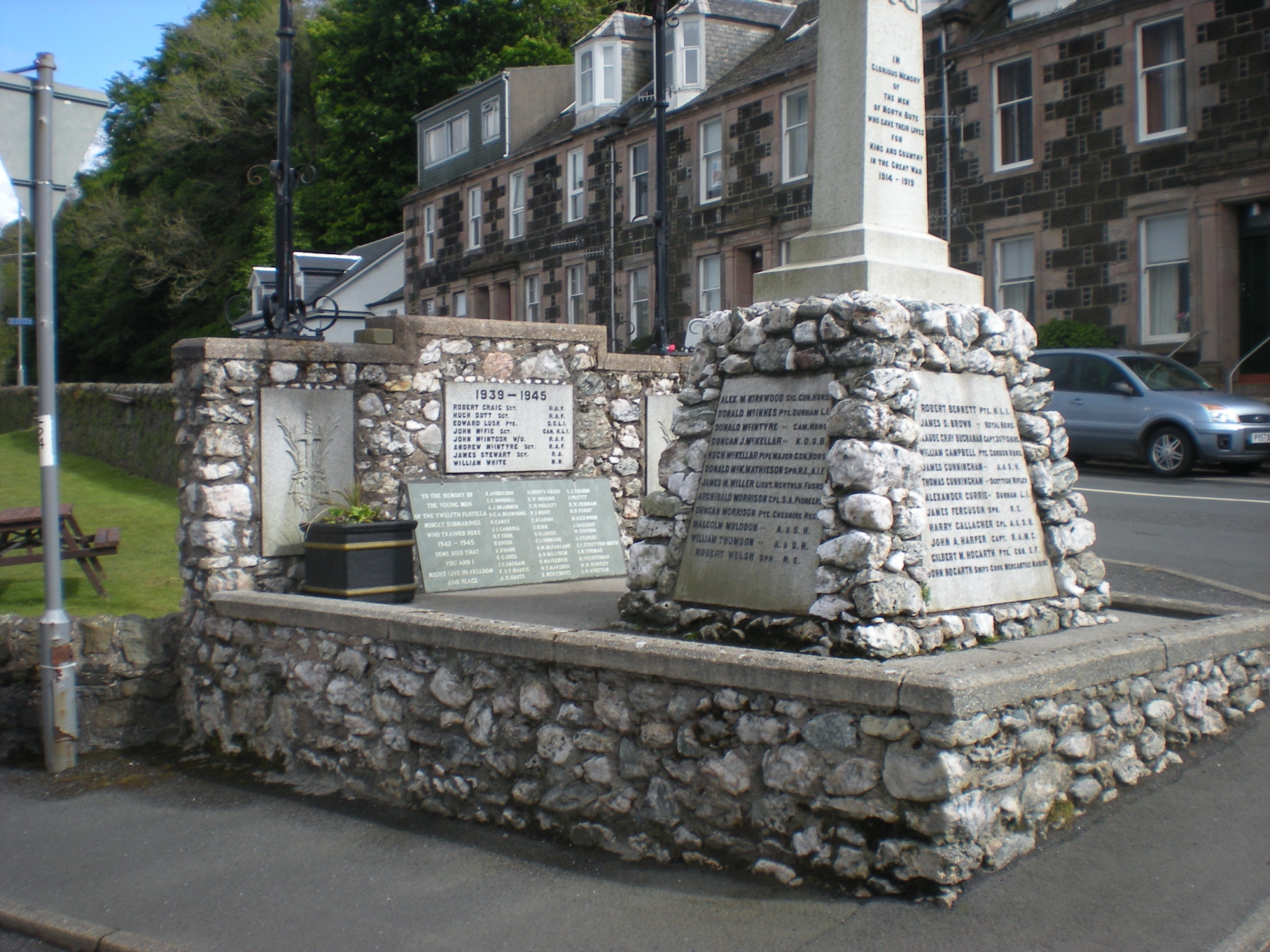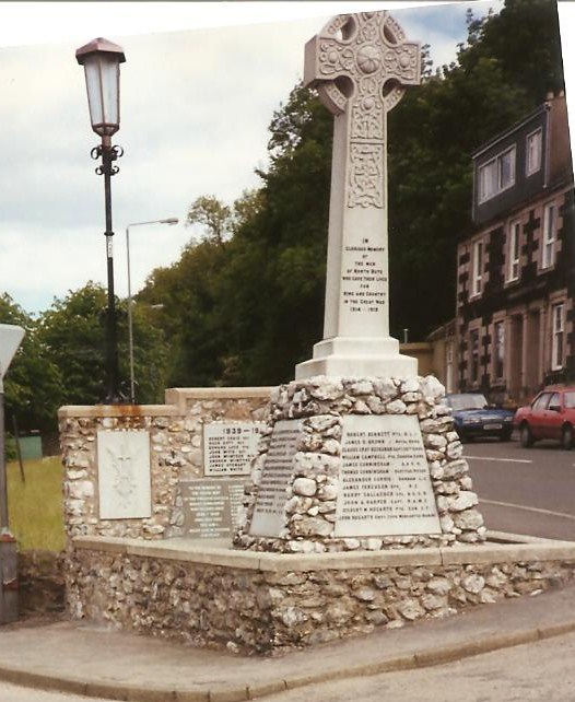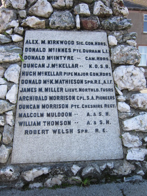 WW1- North Side Plaque- ROBERT BENNETT PTE H.L.I./ JAMES D. BROWN ROYAL HDRS/ CLAUDE GRAY BUCHANAN CAPT. 35TH SIKHS/ WILLIAM CAMPBELL PTE. GORDON HDRS/ JAMES CUNNINGHAM A.& S.H./ THOMAS CUNNINGHAM SCOTTISH RIFLES/ ALEXANDER CURRIE DURHAM L.I./ HARRY GALLAGHER CPL A.& S.H./ JOHN A. HARPER CAPT R.A.M.C./ GILBERT A. HOGARTH PTE. CDN. E.F./ JOHN HOGARTH SHIPS COOK MERCANTILE MARINE; West Side Plaque- WILLIAM HUTTON SGT R.F.A./ NEIL KEITH PTE. CDN. E.F./ GEORGE LOCH DURHAM L.I./ RICHARD LUSK CPL. R.G.A./ ALEXANDER MCALISTER SPR. A.E.F./ NEIL MCALISTER PTE. CAN. HDRS/ WILLIAM MCARTHUR DR. R.F.A./ COLIN MCALLUM PTE. SEAFORTHS/ WILLIAM MCALLUM DURHAM L.I./ DANIEL MCDOUGALL CPL. ROYAL HDRS./ JOHN H. MCDOUGALL A & R. N.B./ NEIL MCKINNON PTE. MACHINE G.C./ East Side Plaque- ALEX M. KIRKWOOD SIG. GDN. HDRS./ DONALD MCINNES PTE. DURHAM L.I./ DONALD MCINTYRE CAN. HDRS/ DUNCAN J. MCKELLAR K.O.S.B./ HUGH MCKELLAR PIPE MAJOR GDN. HDRS./ DONALD MCK. MATHIESON SPR R.E., A.I.F./ JAMES MCMILLER LIEUT. NORTHLD. FUSRS./ ARCHIBALD MORRISON CPL. S.A.PIONEERS/ DUNCAN MORRISON PTE. CHESHIRE REGT./ MALCOLM MULDON A. & S. H./ WILLIAM THOMSON A. & S.H./ ROBERT WELSH SPR R.E./ WW2- ROBERT CRAIG SGT R.A.F./ HUGH DUTT SGT R.A.F./ EDWARD LUSK PTE. D.C.L.I./ JOHN MCFIE SGT CAN. H.L.I./ JOHN MCINTOSH W/O R.A.F./ ANDREW MCINTYRE SGT R.A.F./ JAMES STEWART SGT R.A./ WILLIAM WHITE M.N.