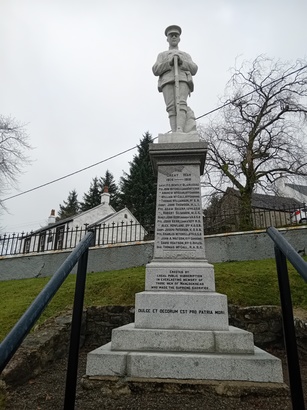 THE/ GREAT WAR/ 1914 - 1918/ (Names)/ 1914-1918/ ERECTED BY/ LOCAL PUBLIC SUBSCRIPTION/ IN EVERLASTING MEMORY OF/ THOSE MEN OF WANLOCKHEAD/ WHO MADE THE SUPREME SACRIFICE/ "Dulce et decorum est pro patria mori" WORLD WAR/ 1939 - 1945/ IN EVERYLASTING/ REMEMBRANCE/ OF THOSE WHO MADE THE/ SUPREME SACRIFICE/ (Names)/ "Be thou faithful unto death/ and I will give thee a crown of life"/ Rev.2.10