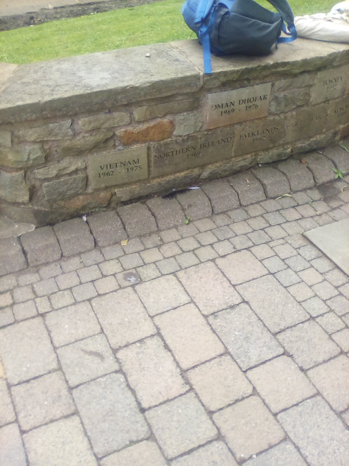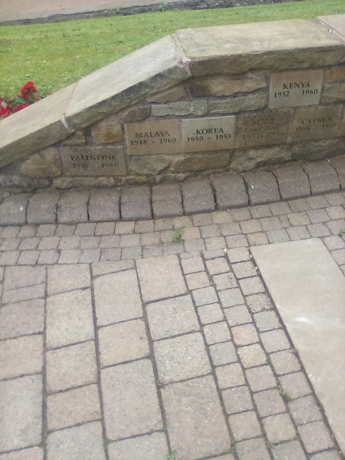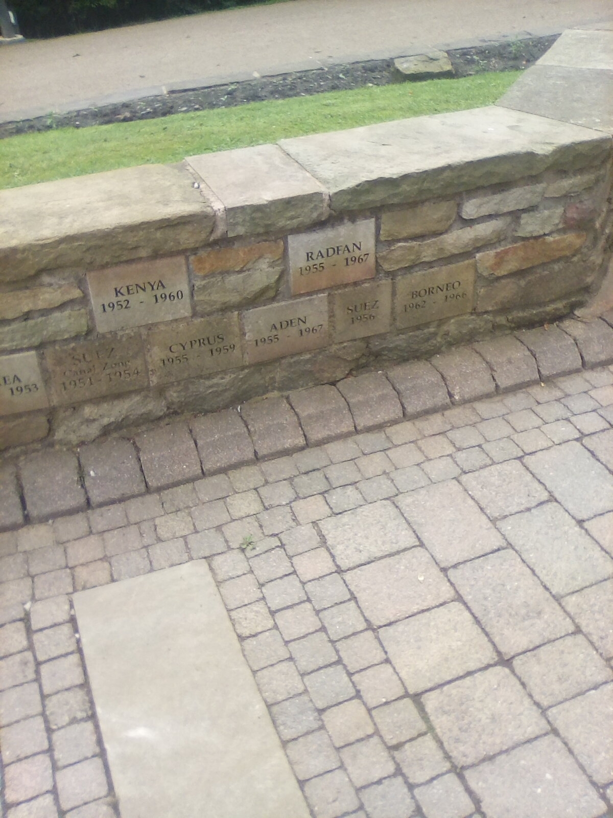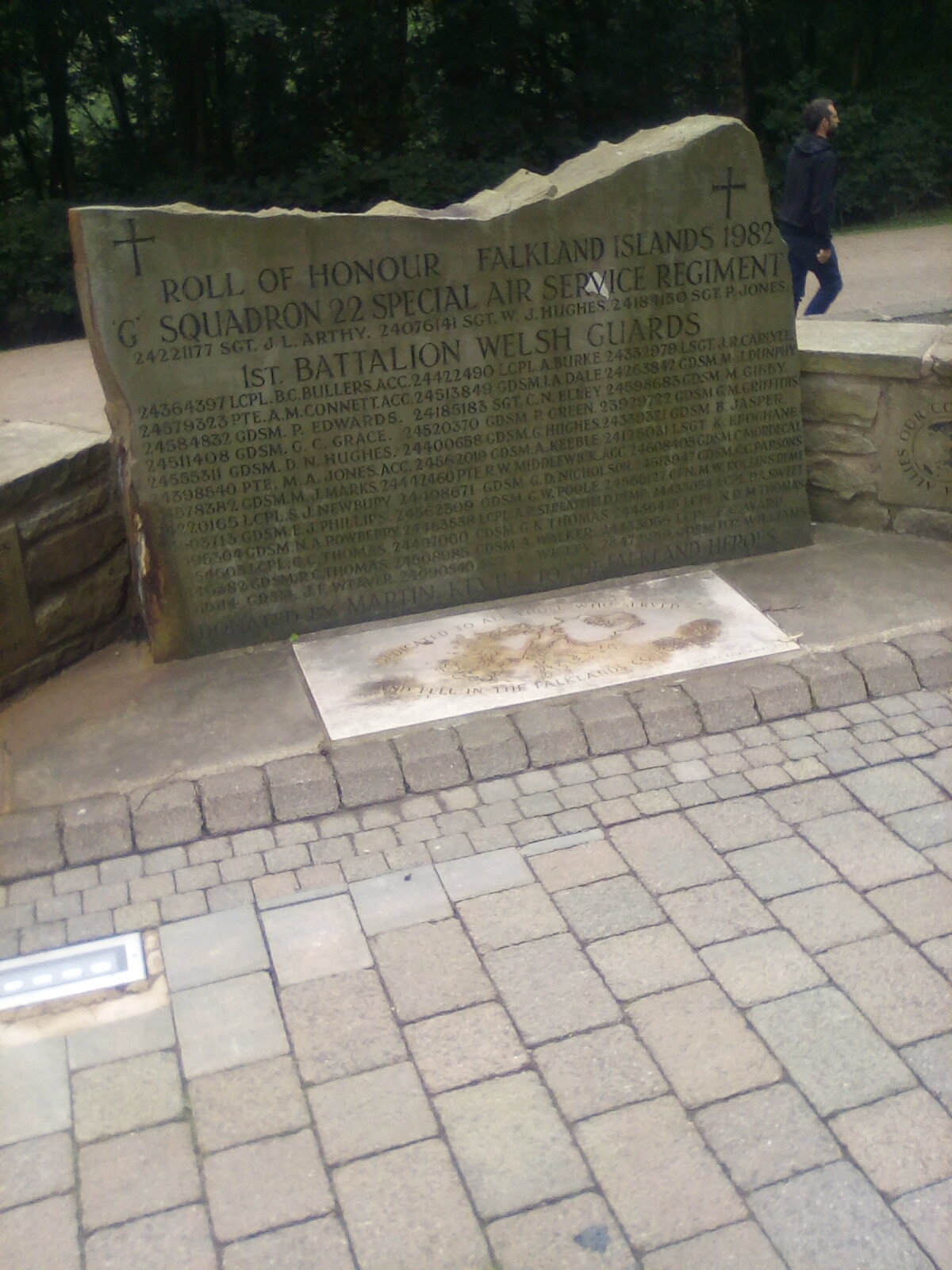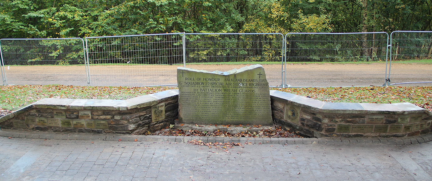 ROLL OF HONOUR FALKLAND ISLANDS 1982G SQUADRON 22 SPECIAL AIR SERVICE REGIMENT 1ST BATTALION WELSH GUARDS DONATED BY MARTIN KEVILL TO THE FALKLAND HEROES Two main stones; OUR ALLIES 1939 - 1945 and OUR COMMONWEALTH ALLIES. Conflict stones have name of conflict and years. Left end of the wall- PALESTINE 1945-1948; MALAYA 1948-1960; KOREA 1950-1953; SUEZ Canal Zone 1951-1954; KENYA 1952-1960; CYPRUS 1955-1959; ADEN 1955-1967; RADFAN 1955-1967; SUEZ 1956; BORNEO 1962-1966; Right end of the wall- VIETNAM 1962-1975;NORTHERN IRELAND 1969; OMAN DHOFAR 1969-1978; FALKLANDS 1982; GULF WAR 1991; BOSNIA 1992; KOSOVO 1999; SIERRA LEONE 2000; AFGHANISTAN 2001-2002; IRAQ 2002