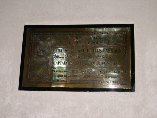 This tablet to the memory of Gerald Nathaniel Pitts Langdon born 27th Nov 1867 - Died 17th Feb 1895 Captain 3rd Battalion Devon Regt. is erected by his brother officers as a token of their sincere esteem and regard.