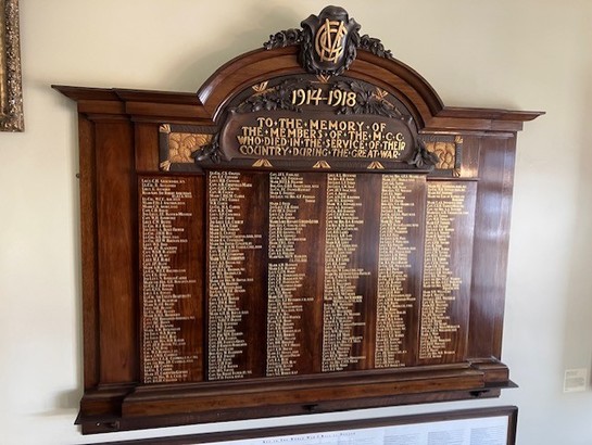 1914-1918 / TO THE MEMORY OF / THE MEMBERS OF THE MCC / WHO DIED IN THE SERVICE OF THEIR / COUNTRY DURING THE GREAT WAR
