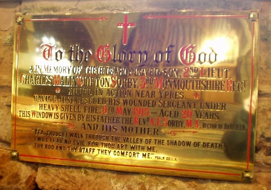 To the Glory of God & In Memory of Their Dearly Beloved Son, 2nd Lieut. Charles Malin Clifton Sorby, 3rd Monmouthshire Regt. Killed in Action near Ypres. Having just rescued his wounded Sergeant under heavy shell fire. 8th May 1915 - Aged 20 years. This window is given by his Father the Revd A E Sorby MA Rector of Darfield And his Mother 'Yea, though I walk through the valley of the shadow of death I will fear no evil for thou art with me, Thy rod and thy staff they comfort me' Psalm XXIII 4.