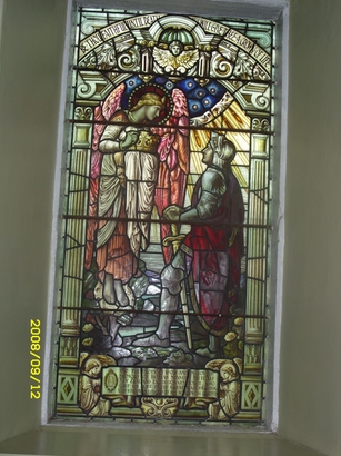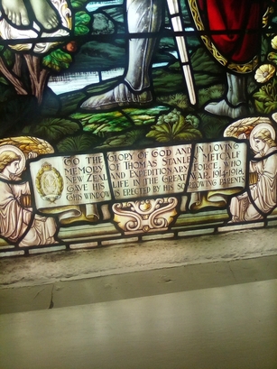 Top of the window-“Be thou faithful unto death and I will give thee a crown of life.”/ At the base-“To the Glory of God and in loving/ memory of Thomas Stanley Metcalf, /New Zealand Expeditionary Force, who/ gave his life in the Great War, 1914-1918. /This window is erected by his sorrowing parents.”