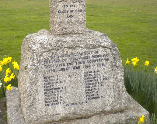 TO THE GLORY OF GOD AND/ IN GRATEFUL MEMORY OF/ THE MEN OF THIS PARISH WHO GAVE/ THEIR LIVES FOR THEIR COUNTRY/ IN THE GREAT WAR 1914-1918/ (NAMES)ON PLAQUE ON BACK OF MEMORIAL: IN MEMORY OF THE CANADIAN TROOPS/ WHO LEFT WISBOROUGH GREEN ON 19TH AUGUST 1942/ TO TAKE PART IN THE RAID ON DIEPPE/ MANY OF WHOM PAID THE SUPREME SACRIFICE